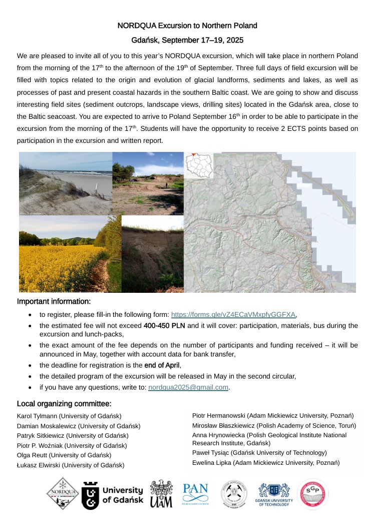 The Nordic Union for Quaternary Research (NORDQUA) is interested in the last 2.6 million years of Earth’s history (the Quaternary) – also known as the ‘Ice Age’. The aim of the Union is to encourage broad interdisciplinary cooperation and communication among Quaternary scientists in Norden, and especially to facilitate networking between young scientists. This is done through organizing joint field excursions and symposia, and by informing about student and job opportunities.