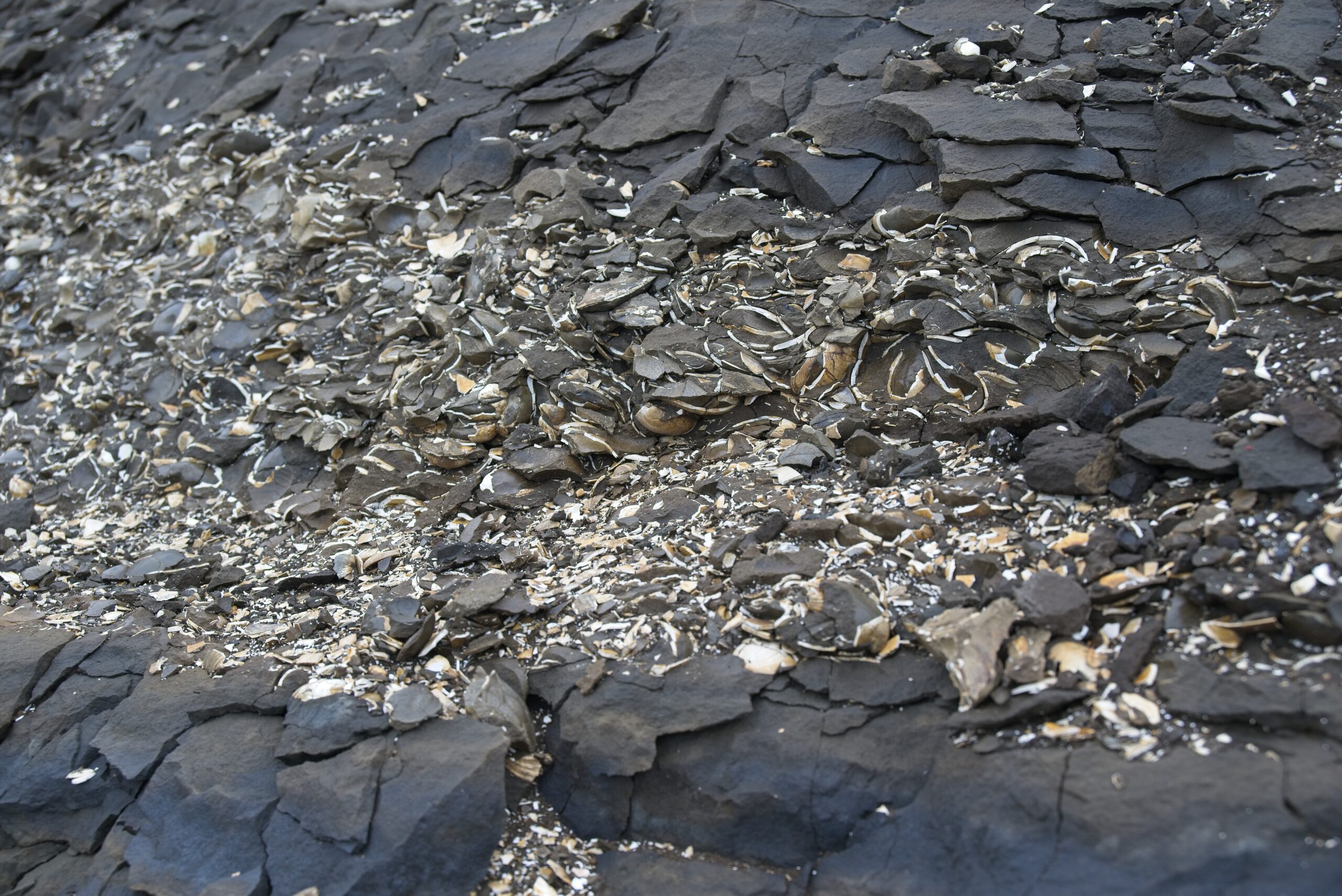 Led by Ólafur Ingólfsson, the day began at Tungulending examining part of the Tjörnes beds deposited during the Pliocene after 4.3 Ma. Abundant mollusc fossils found in the cliffs here – up to 100 different species – record a cooling shallow marine environment that started with water temperatures 5-10C warmer than today. Lava above these mollusc layers dates to ~2.6 Ma.
