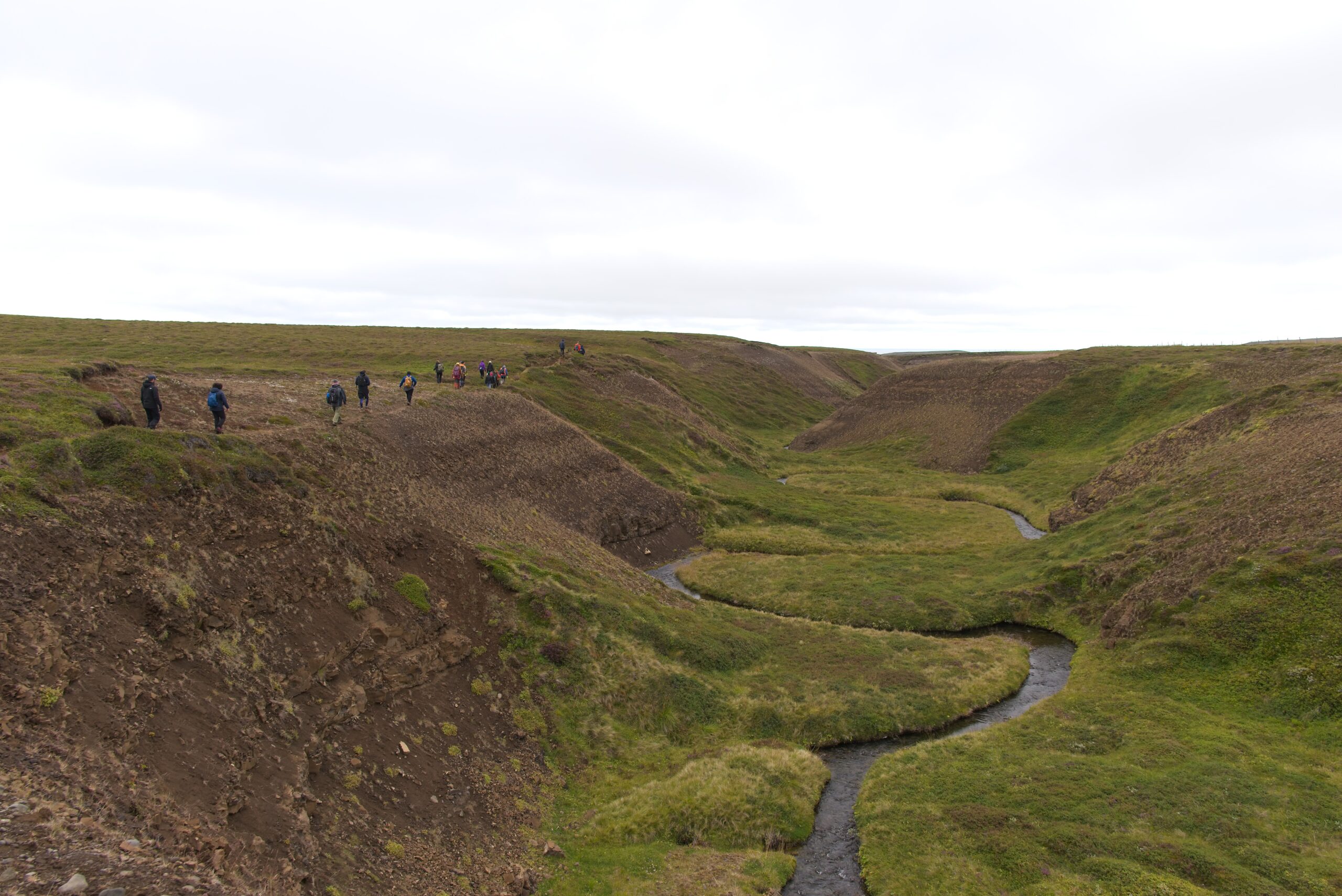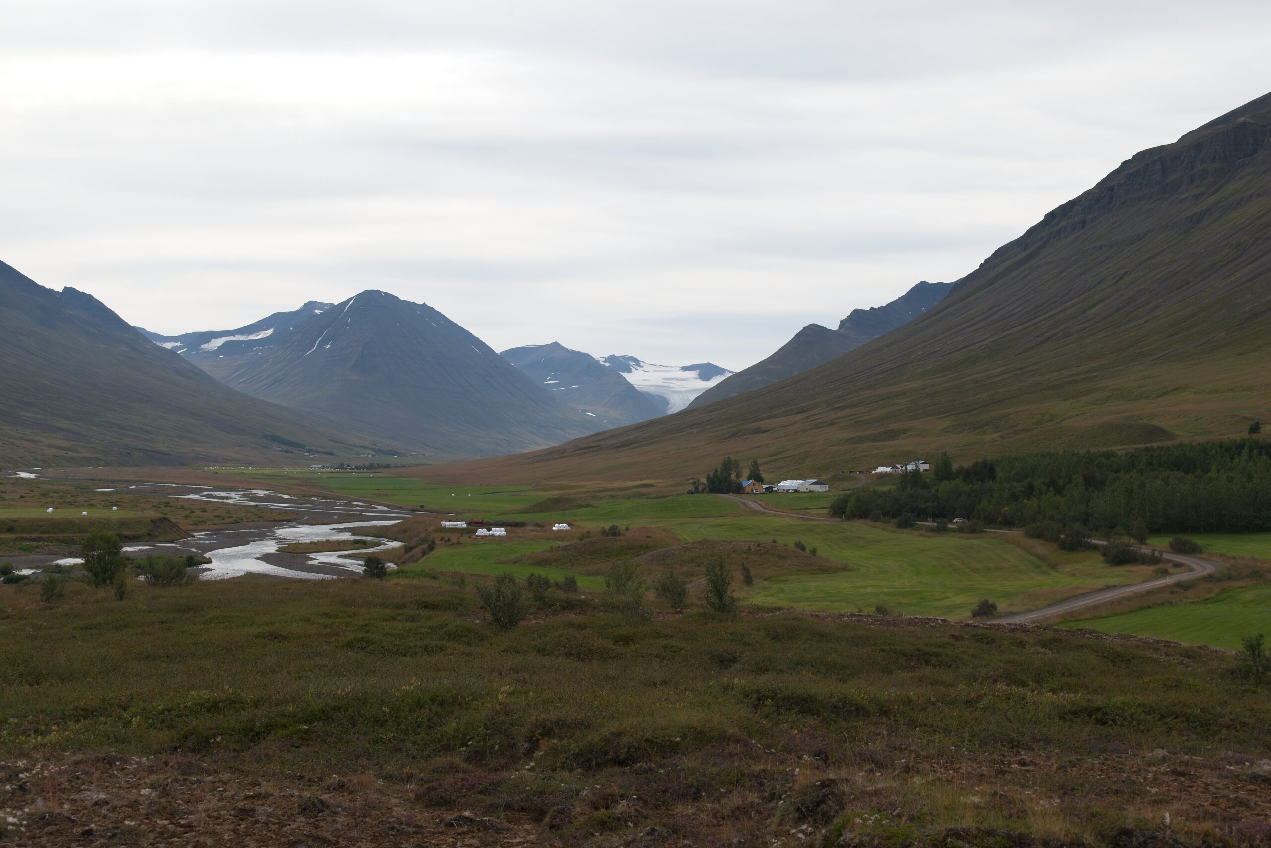 Some 20 km into the Eyjafjörður main valley, we stood on what was the glacier’s terminal moraine, constituted of reworked marine sediments. Successive instances of glacial advances and retreats have led to as many marine regressions and transgressions, triggered by the sensitivity of Iceland’s northern rim to isostatic processes. As evidenced by the mountains in the background, the Eyjafjörður valley glacier has carved several hundred metres deep into the plateau bedrock.