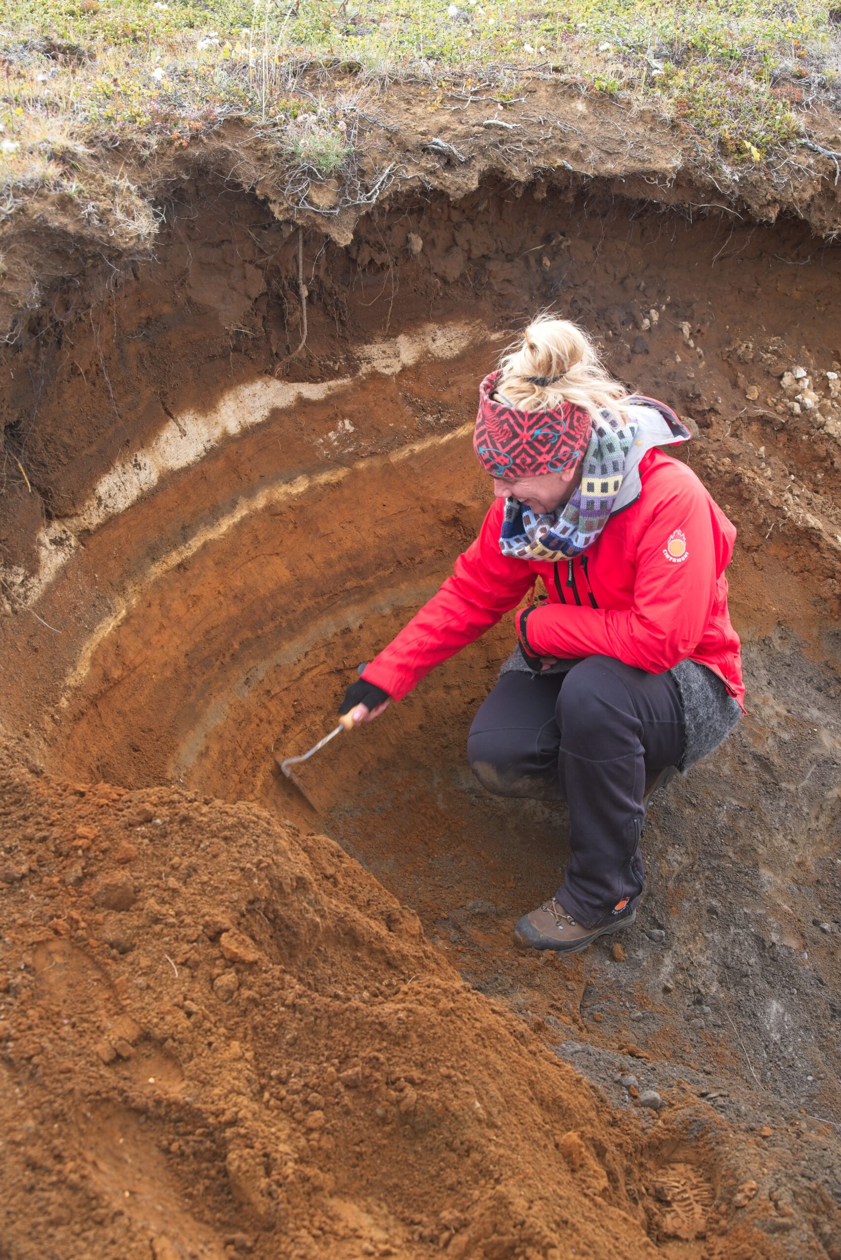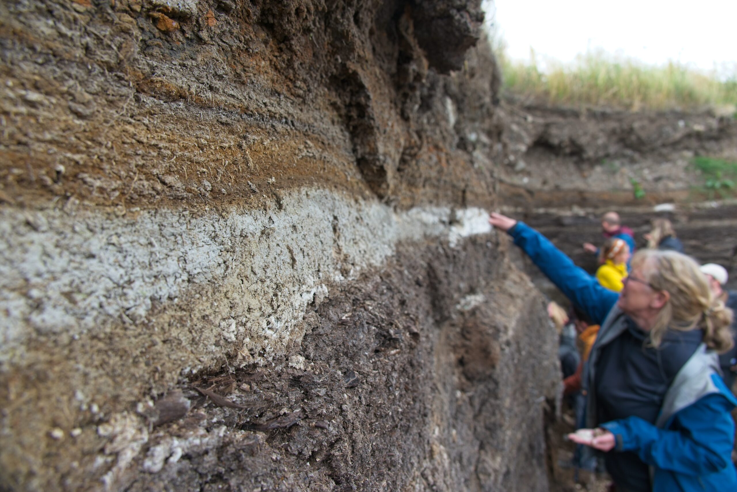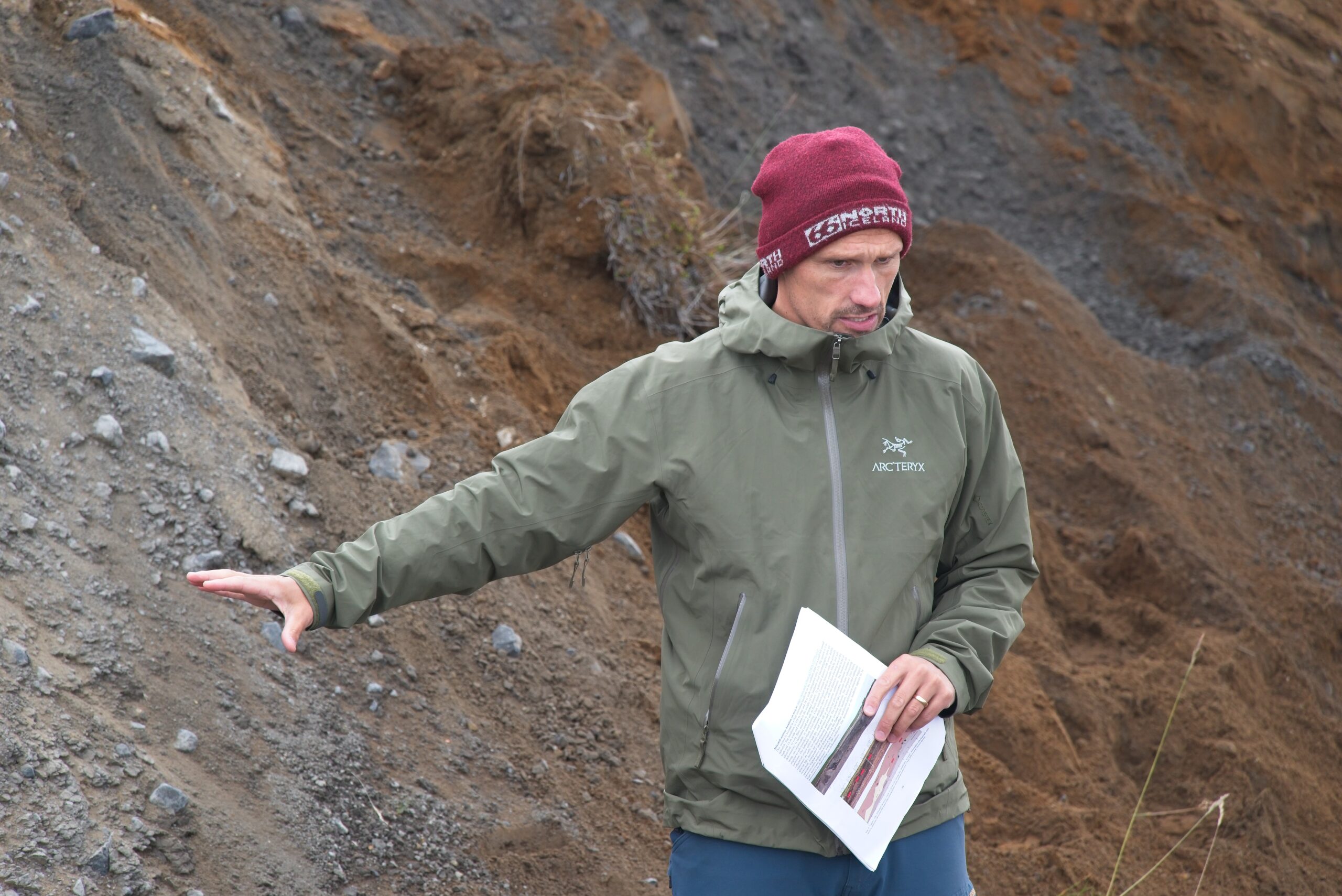 In the afternoon we turned around and travelled far up the main Eyjafjörður valley to visit some interesting deposits scattered along the way. Among them were a terminal moraine made of reworked coastal marine sediments, and another large landslide deposit. Upon returning to Akureyri, we stopped one last time at a newly excavated site where we could see many different tephra layers corresponding to various eruptive events. Many volcanoes such as Hekla erupt in two phases: the first white ash plume is acidic because the less dense rhyolitic magma sits on top of the magmatic chamber; then if the eruption continues it bursts out denser basaltic material that creates an overlying black tephra layer.