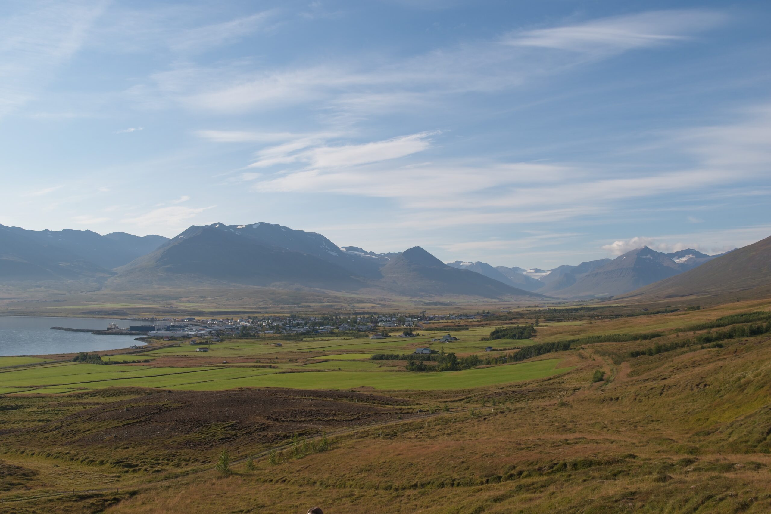 We stopped above Dalvík to observe several moraines left by corrie glaciers. Their location in the landscape, with lateral moraines aligned with the slope and terminal moraines perpendicular to the valley axis, can make them a prominent feature deflecting avalanches, which has influenced the localisation of human settlements and buildings. The presence of these glacial remnants shows that while the large valley glaciers disappeared during the deglaciation, a discontinuous ice cover persisted throughout the Holocene in the mountains of the Tröllaskagi peninsula.